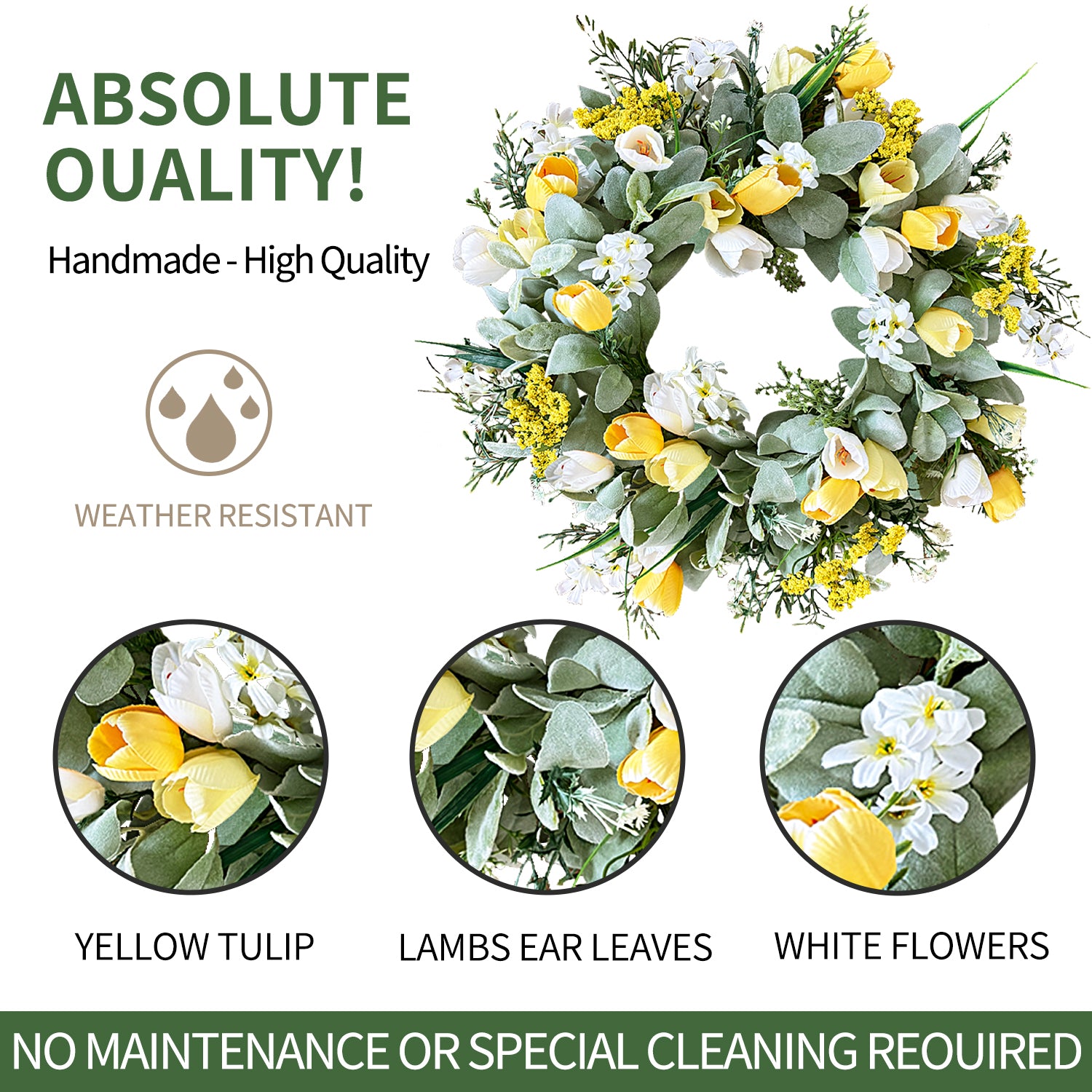 Full and Realistic Lambs Ear Wreath: Qingbei Rina's handmade wreath is embellished with yellow and white tulip blossoms and Lambs Ear leaves, making the wreath full, natural and realistic. Its elegance adds vibrancy and delightful ambiance to your home.